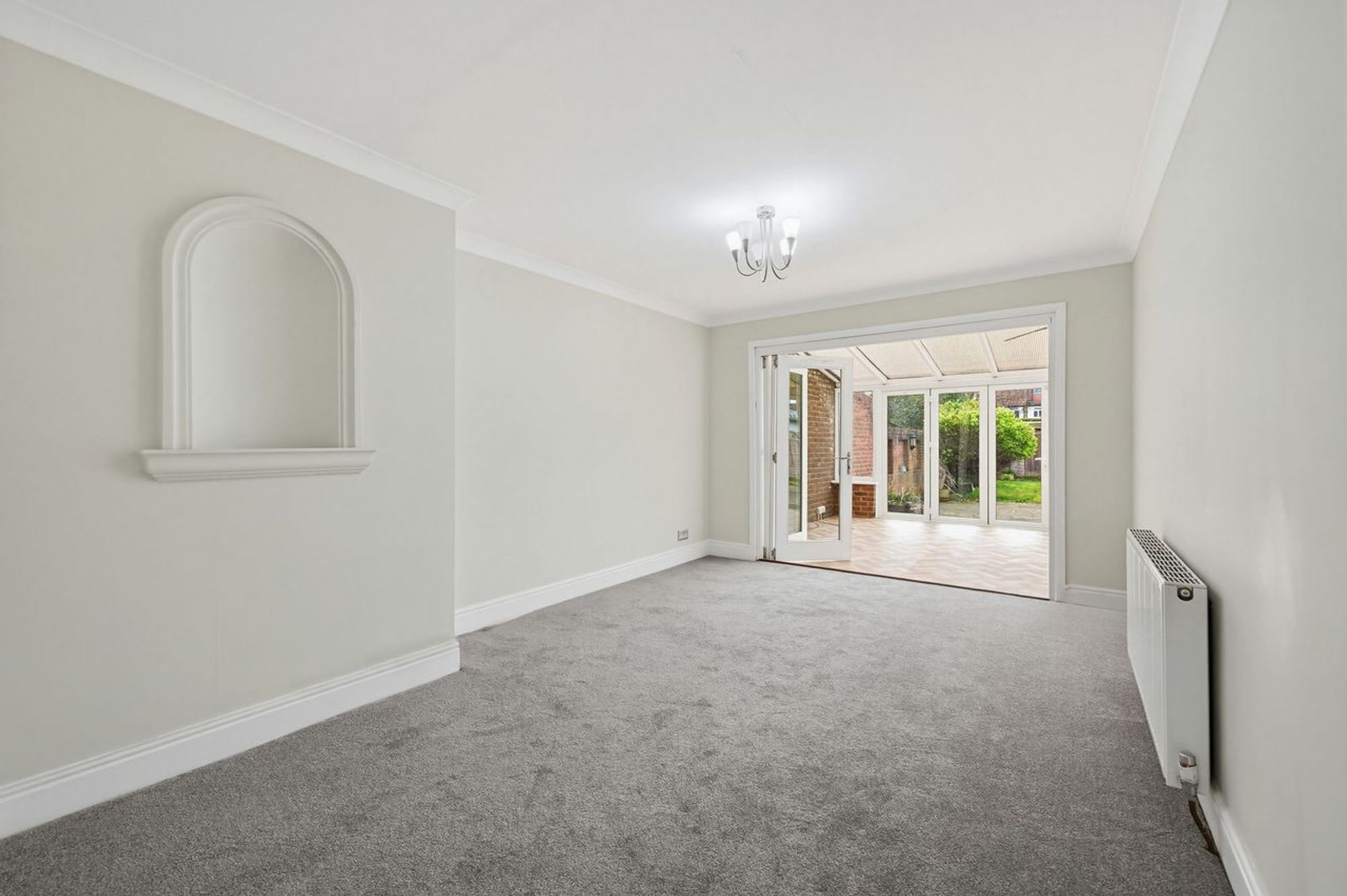 The ground floor comprises a welcoming hallway, bay-fronted dining room, spacious reception room, a well-appointed kitchen with ample storage, and a bright conservatory with doors opening onto the beautiful large garden.