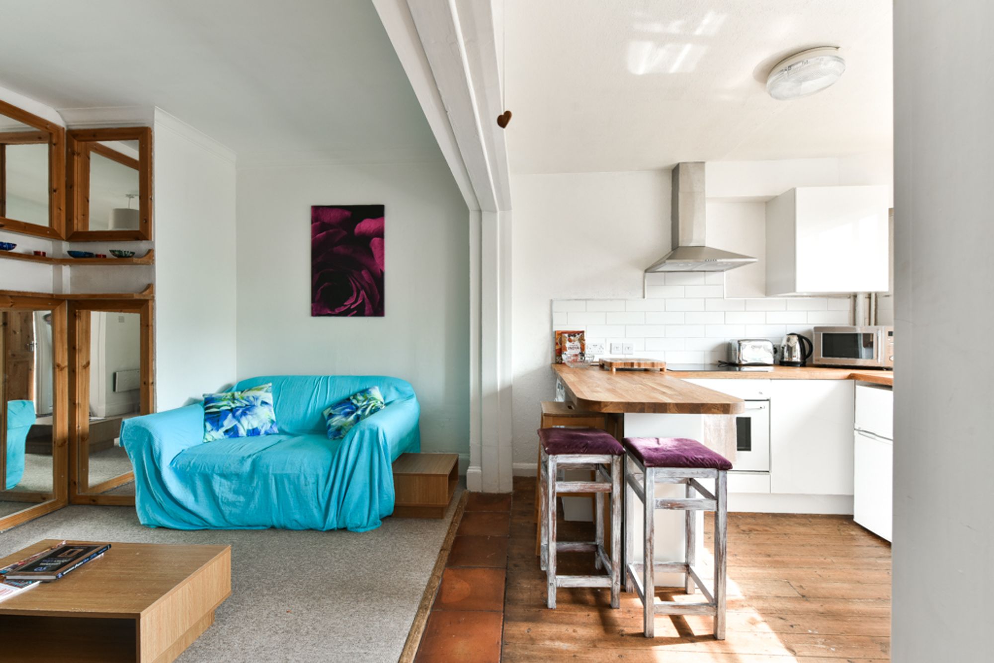 The property features a generously sized double bedroom with built-in wardrobe space, alongside an open plan kitchen and reception room.